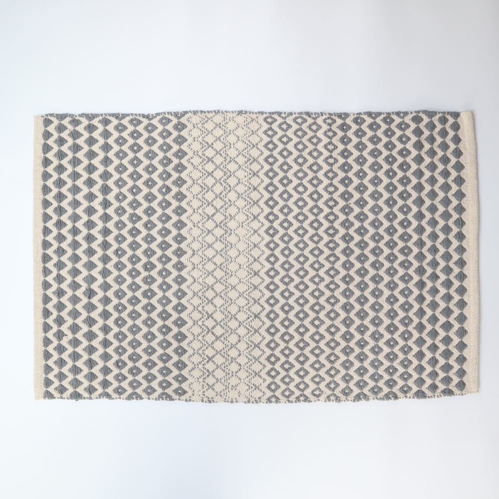 Grijs/blauw en ecru mat met een weefpatroon.