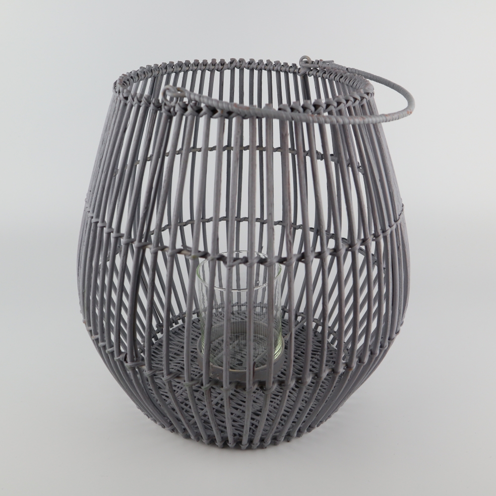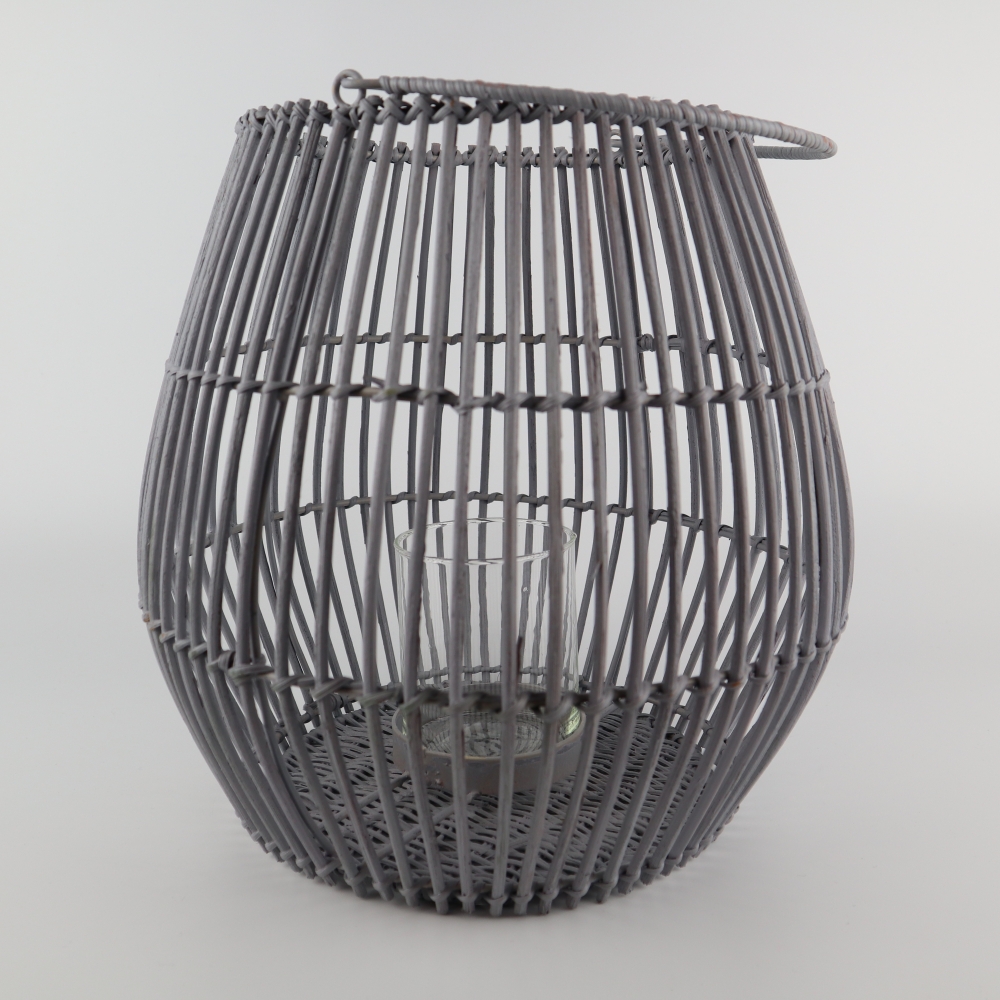 Grijze lantaarn van rotan inclusief glazen kaarsenhouder.
